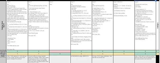 For reference, below are the tracking methods I use for my own training, which includes an excel sheet that tracks my CrossFit skill training (morning workouts) and my notebook that tracks my conjugate training/strength training (afternoon workouts):