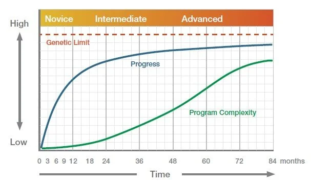 Progress is NOT linear. It is very unlikely that you will be increasing your weights and rep maxes every week. Eventually, as you become more experienced, your rate of progress will slow down and your program’s complexity will need to increase. This is because you are reaching your “genetic limit”, as seen below in the graph. If we were capable of linearly progressing every week, we’d be benching thousands of pounds…which is pretty cool, and I wish that was the case.